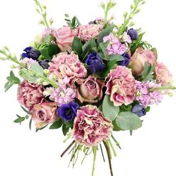 Inspired by the vibrant neighbourhoods and abundant green spaces of Thamesmead, this hand-crafted bouquet is a true celebration of local beauty and expert design. Deep blue and indigo hydrangeas, bold and multifaceted, form the dramatic heart of the arrangement, conjuring the tranquil hues of the Thames marshes at twilight. Wrapped around them are soft lavender roses and creamy white blooms, their petals exquisitely unfurled and symbolizing gentle affection or heartfelt congratulations. Creamy white ranunculus add texture and lushness, each tightly wound petal reminiscent of the tender freshness found along the banks of Lesnes Abbey Woods. Pale yellow and chartreuse lisianthus buds stretch upwards, imparting an airy touch and lively energy. Filler flowers in vivid fuchsia-pink dance amidst the bouquet, while plumes of pale pink astilbe create a delicate, whimsical silhouette, reminiscent of wildflowers brightening Birchmere Park. Sprigs of lacy green and white, perhaps Ammi Majus, softly frame the composition. Dark green leaves are interspersed to enhance both vibrancy and dimension. The whole ensemble is finished with a regal, glossy purple satin ribbon, a gleaming complement to the cool, subtle tones within. This bouquet from Florist Thamesmead is perfect as a grand centerpiece or a heartfelt gift, its colours and textures echoing nature and neighbourly warmth across Thamesmead.